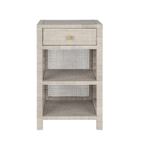 - A tightly wrapped, natural peeled rattan frame complements the dense basket weave of the natural, peeled rattan top, side, and double shelves.