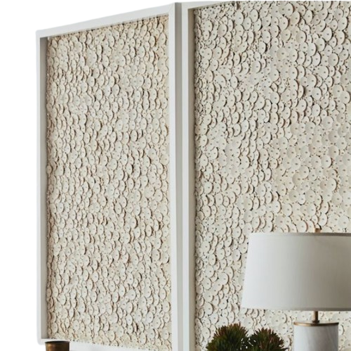 Décor features coconut shell discs and beads hand-sewn together over a metal base with a cream finish wood frame. Wall décor comes with metal hangers for mounting both vertically and horizontally.