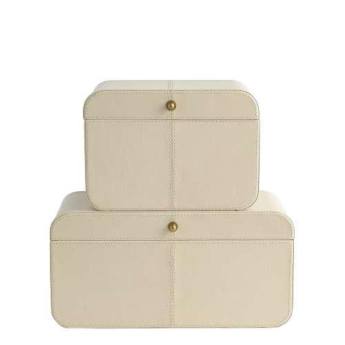 Ivory cowhide leather is used on our Curved Corner Box. Beautiful stitching creates the simple yet sophisticated design of the box. Lined with matching suede cloth facbric.