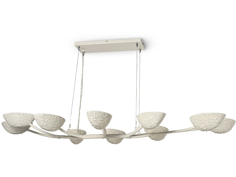 Fully adjustable chandelier features tiny coco beads combined with larger wood beads all in a matte cream finish set in a fiberglass shade, accented with finely woven white abaca rope details. Chandelier is complete with a matte cream finished metal canopy hanging kit and adjustable cable wires, which are easily cut, allows customizable hanging heights. Professional installation recommended.