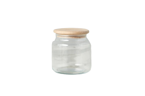 - Glass base with hand-turned wooden lid.