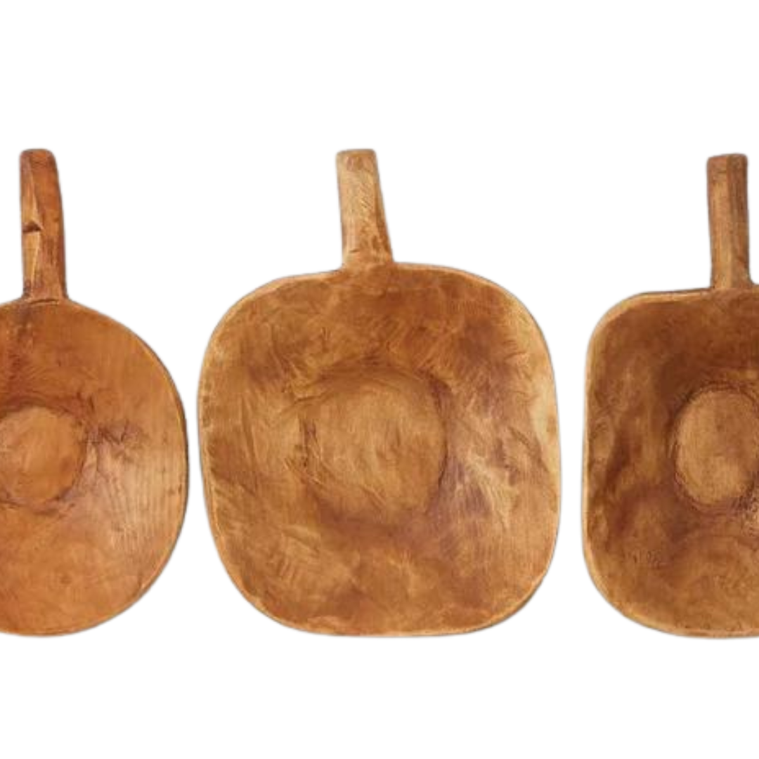This handcrafted Found Scoop Bowl, is a versatile home accent with a rustic charm. Use it as a catch-all, fruit bowl, or individual place setting. The convenient carved handle allows for easy carrying. Each bowl is unique in shape, size, and color due to its handcrafted nature.