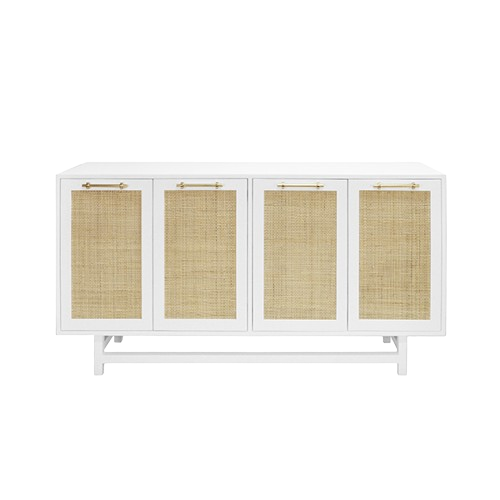 On trend for good reason! Our four door Macon cabinet offers beautiful and neutral storage for your Mid Century, Farmhouse, or Scandinavian inspired interiors. Natural cane door fronts are expertly paired with a finish palette of matte white lacquer and brass hardware. An extraordinary accent piece for any room.Â
