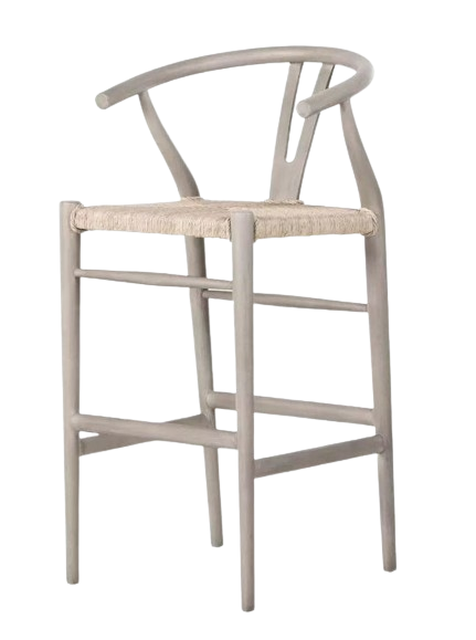 Modern curves redefine the classic wishbone-style bar stool. Vintage white all-weather wicker is woven for a dose of texture within weathered grey teak framing. Cover or store indoors during inclement weather and when not in use. 42"H.