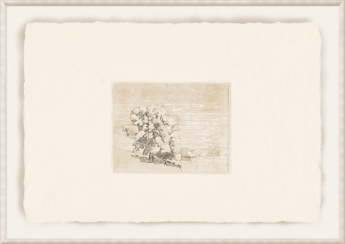 This small, delicate drawing features a beautiful landscape view. White highlights stand out against the soft brown and black of the sketch, adding dimension. The small scale of the drawing, in combination with the negative space around it, creates a feeling of intimacy with the image, urging you to take a moment and get a closer look at the finer details captured with the strokes.