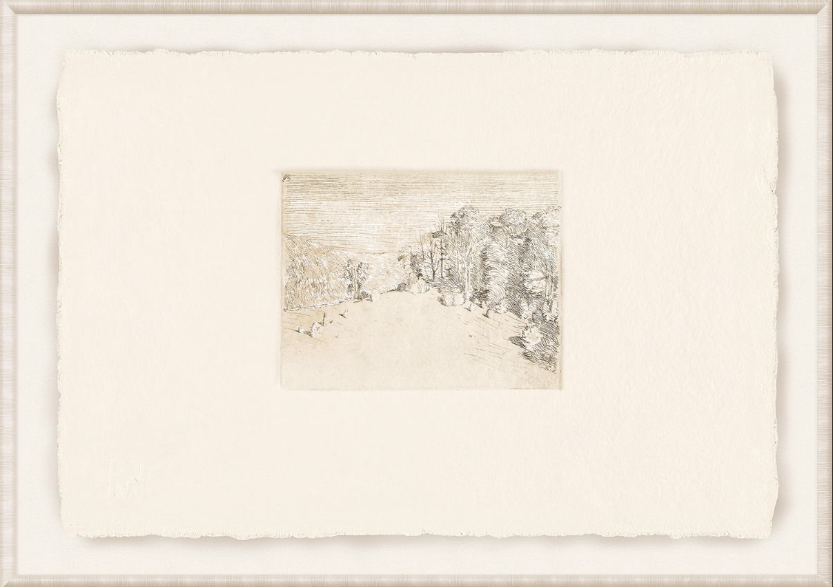 This small, delicate drawing features a beautiful landscape view. White highlights stand out against the soft brown and black of the sketch, adding dimension. The small scale of the drawing, in combination with the negative space around it, creates a feeling of intimacy with the image, urging you to take a moment and get a closer look at the finer details captured with the strokes.