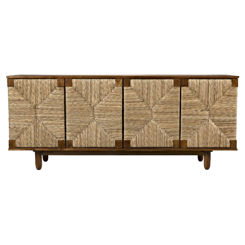 Teak pairs beautifully with natural sea grass in this updated classic. Designed to provide for maximum display space across the teak top, it also features two generous lower compartments with one fixed shelf each.