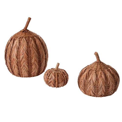 Enjoy the beauty of harvest year after year with these forever pumpkins that bring warm earthy texture to any space. This set of 3 Woven Pumpkins are handmade in Vietnam from rattan. Super lightweight with dimensional ridges, an open base, & a natural tone, these gourds can sit anywhere that need a seasonal touch, from a tabletop centerpiece to a console to a mantle.